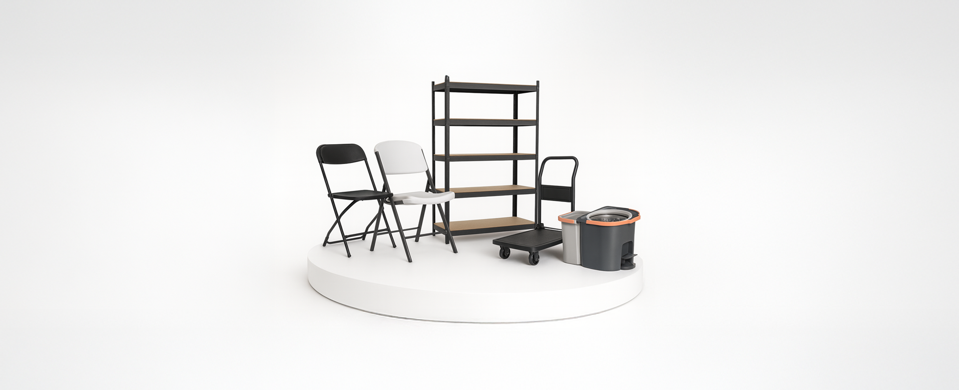 Mesas, sillas, racks, carros de carga y sets de limpieza diseñados para cafeterías, oficinas, hogares, pequeños comercios y eventos. Todo lo que necesitas en un solo lugar.